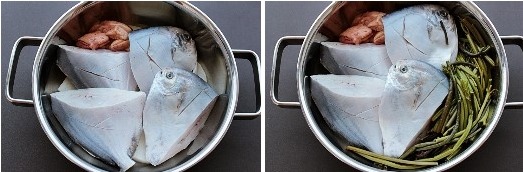 냄비에 무를 깔고 그 위에 손질한 병어와 병어알을 얹는다