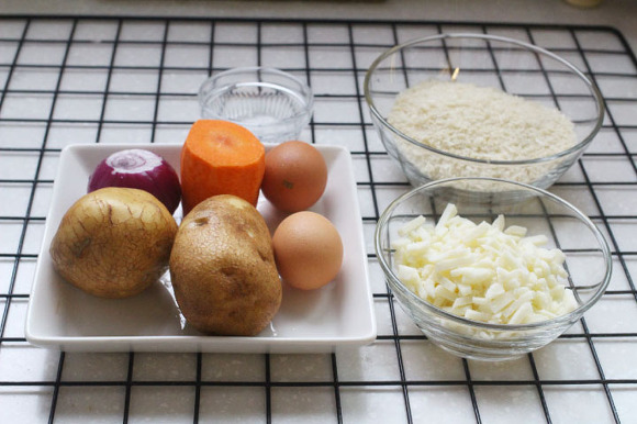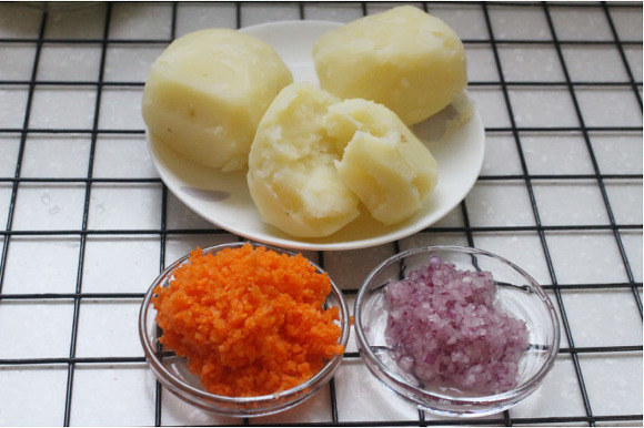재료: 감자2~3개, 계란,당근1/3,양파1/2,빵가루
