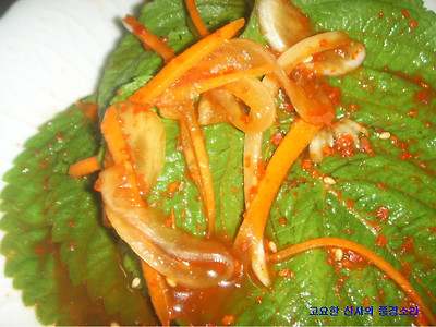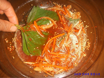 ㉣ 깻잎 3~4장을 쥐고 양념을 뭍어 담아둔다.