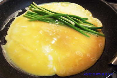 ㉡ 후라이펜에 달걀을 붓고 소금에 데쳐놓은 마늘쫑을 올려놓고 돌돌말아준다.