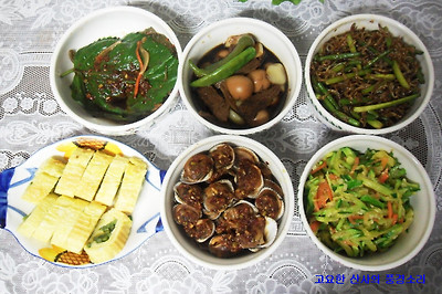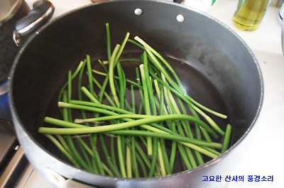 ㉠ 잔멸치는 불순물을 가려내고, 마늘쫑은 끓는물에 살짝 데친다.