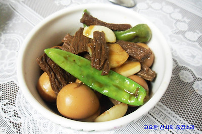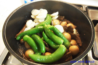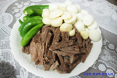 ▶ 재료 : 쇠고기 300g, 메추리알 100g, 마늘 10쪽, 청양초 7개 정도, 진간장 1컵, 꿀 3~4스푼