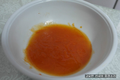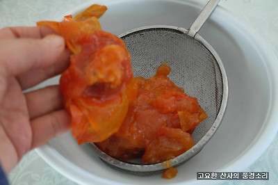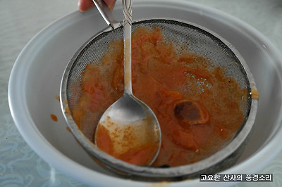 ㉡ 홍시 씨와 꼭지를 떼어 낸 다음 체에 내린다.
