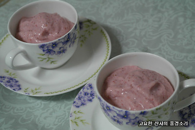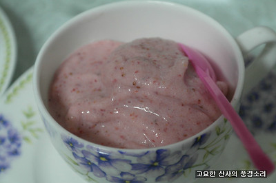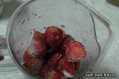 ㉡ 믹스기에 딸기와 우유를 넣고 갈아주면 완성된다.