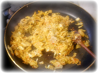 3. 프라이팬에 참기름을 두르고 다진양파와 김치를 달달달 볶는다