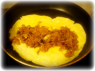 계란물을 1/3을 붓고 그 위에 김치볶음을 담는다