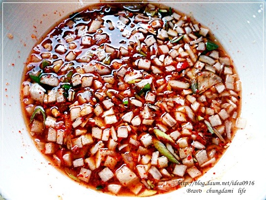 고추가루 1술반, 소금 조금을 넣고 잘 섞어주면 양념장도 끝.