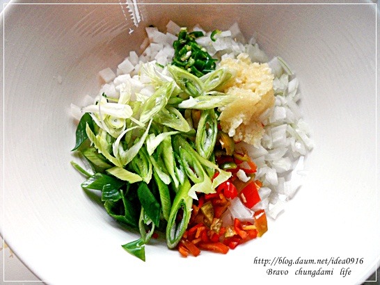 양파, 청.홍고추, 다진마늘, 대파를 썰어 양념장을 만듭니다.
