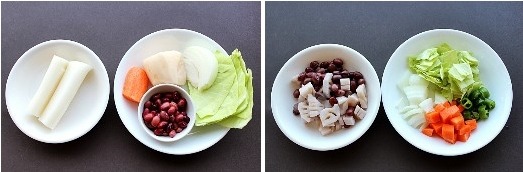 당근, 양파는 사방 1cm크기로 썰고, 양배추는 좀 더 크게 썬다