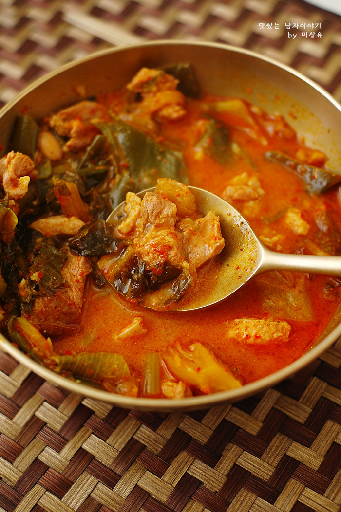 육수를 내서 신김치와 오리와 양념을 넣고 끓이다 대파와 들깨를 넣고 마저 끓이면 완성!