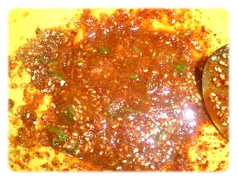 2. 진간장1, 고춧가루1, 매실즙2, 올리고당1,다진마늘, 풋고추, 참기름, 들기름, 통깨, 들깨가루 약간씩을 넣고