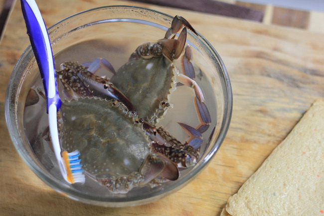 솔을 사용해서 꽃게의 다리 사이와 입 주변을 깨끗하게