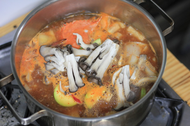팔팔 끓어 오르는 국물에 손질한 꽃게를 넣어 주고