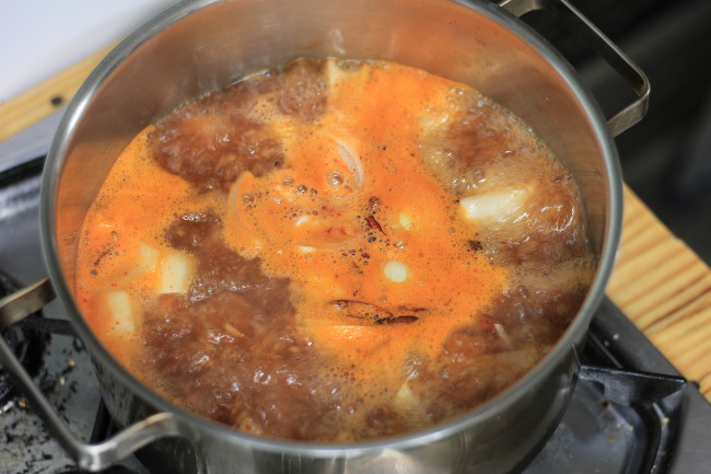 약한불에서 20분 정도 우려 준 다음 건더기들을 건져 내 주었습니다.