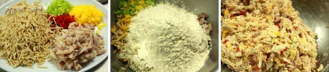 2. 다진 오징어와 야채를 넣고 소금과 후추를 넣어 간을 한 다음 튀김가루를 넣어주세요.