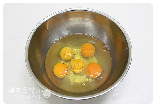 볼에 계란 5개,소금 1/2작은술,후추약간을 넣고 고루 잘 풀어 줍니다.