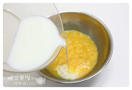 여기에 우유 1/3컵을 넣고 고루 잘 섞어 계란물을 준비해 줍니다.