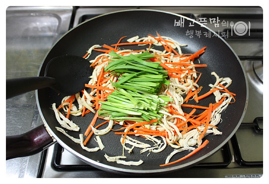 부추를 넣고 볶아 주세요.