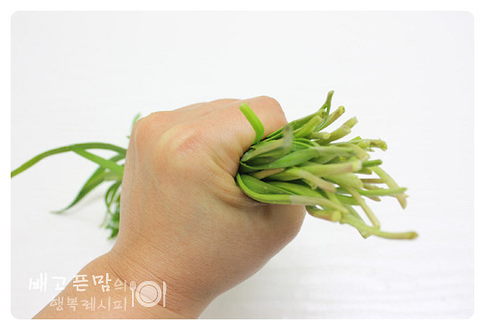 다듬어 씻은 부추를 국수 1인분 분량만큼 손으로 요렇게 쥐어 주세요.