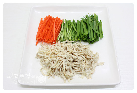삶은 닭가슴살은 한김 식혀 결대로 찢어 준비해 줍니다.