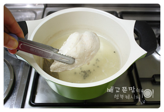 깨끗하게 씻은 닭가슴살 1조각을 넣고 삶아 주세요.
