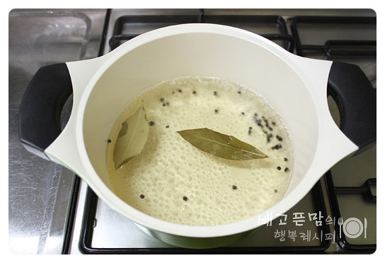 냄비에 물 5컵,통후추 1/2작은술,월계수잎 2장을 넣고 끓여 줍니다.