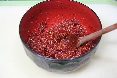 그릇에 고추가루10T. 다진마늘1T반. 다진생강1/5T. 배즙3T. 멸치다시마육수4T. 매실청1T. 설탕1T.
