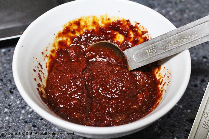 양념 : 국간장 3큰술, 매실청 1큰술, 고추가루 3큰술, 청주 1큰술, 다진마늘 1큰술, 후추가루