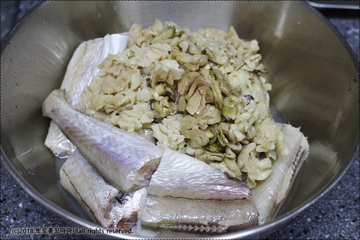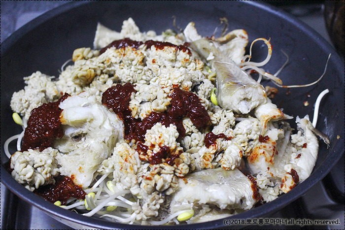 삶은 코다리와 이리, 양념장을 싹싹 긁어 넣은 뒤에