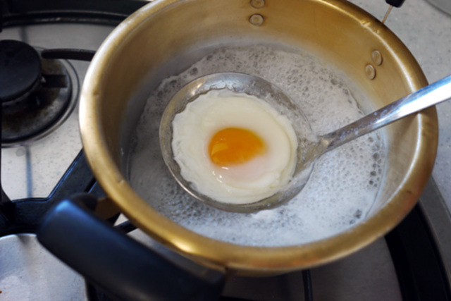 # 수란은 국자에 계란을 깨트려서 끓는물에 살짝 삶아주시면