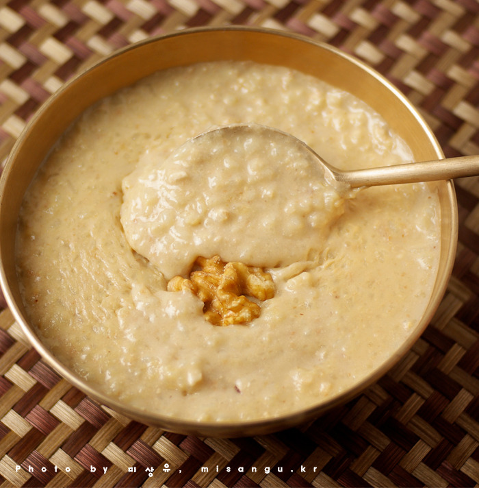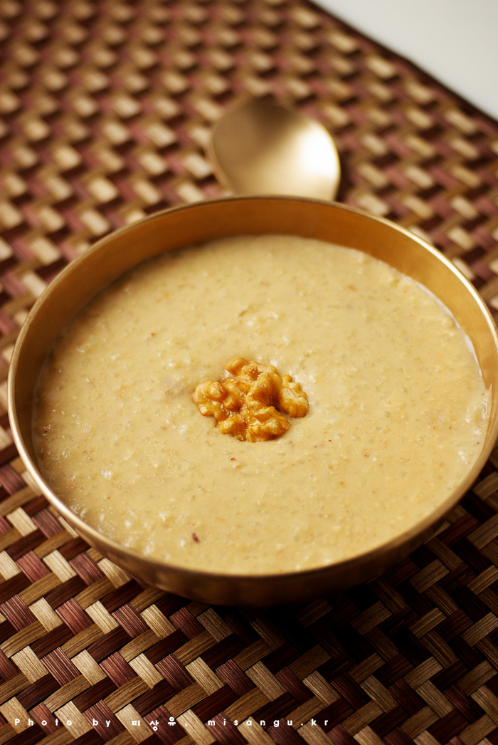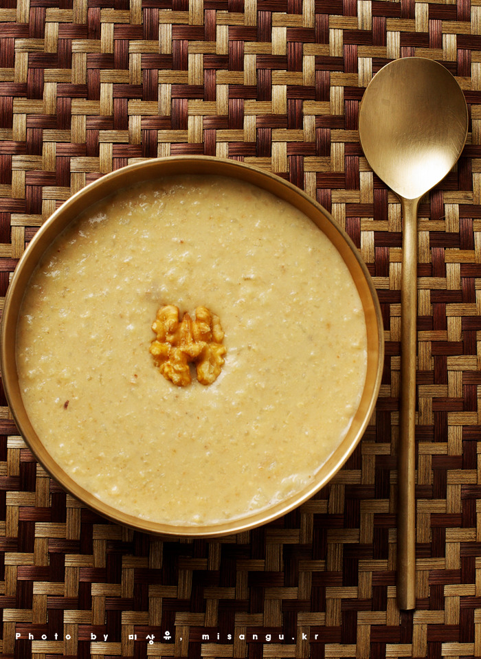Tip. 밥 대신 생쌀을 물에 불린 후 호두와 함께 갈아서 참기름에 살짝 볶다 물을 붓고 끓여도 좋습니다.