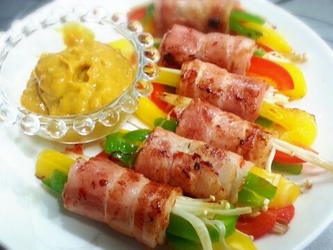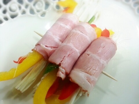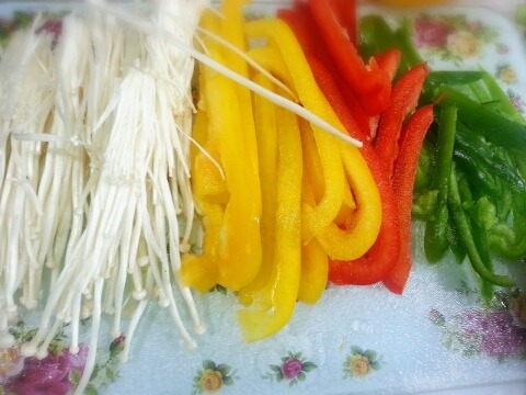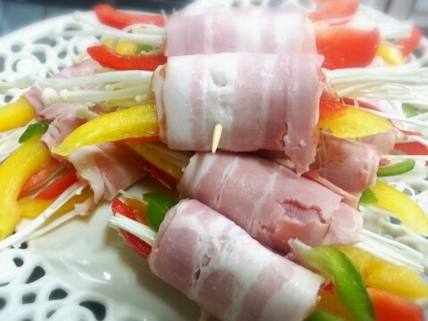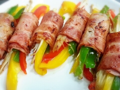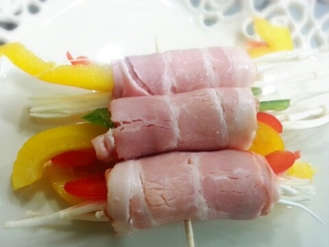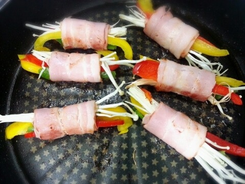 재료:베이컨 두팩, 피망반개, 빨간파프리카 반개, 노란파프리카 반개, 팽이버섯 1/3팩