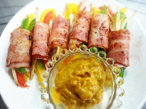 베이컨 한장에 김밥싸듯 올리고 돌돌말아 꼬지로 고정시켜주세요