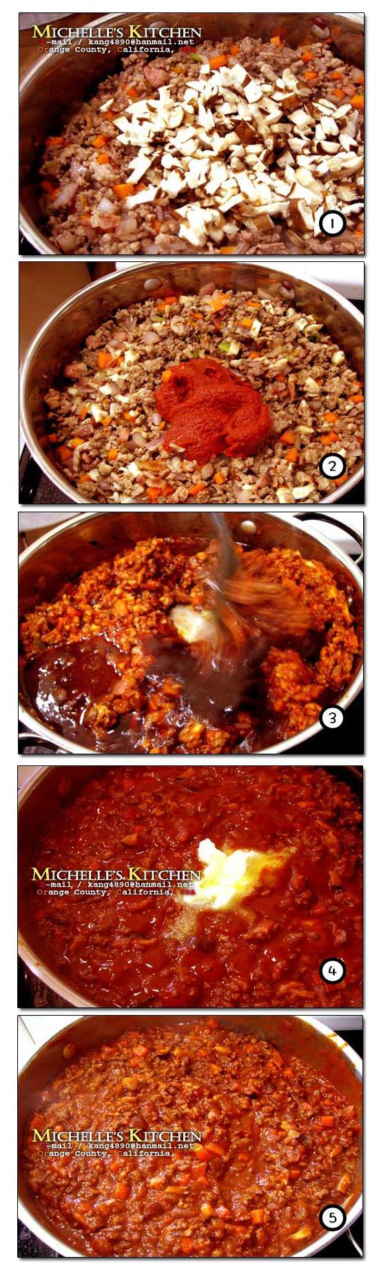 1. 갖은 야채와 고기를 볶은 팬에 표고버섯을 다져서 넣어준다.