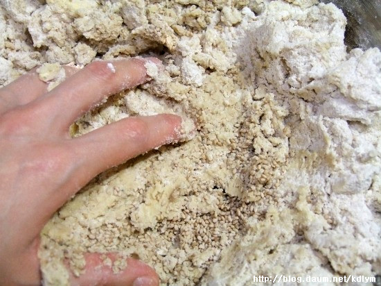 주걱으로 반죽하기에.. 힘이드시면.. 손으로 재빨리 반죽이 한덩이가 되도록.. 치대주세요..