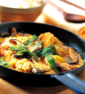 5. 달군 팬에 기름을 두르고 표고버섯과 양파, 굵은 파를 볶다가 다시마국물을 붓고 간장, 조미술, 설탕을 넣어 고루 섞는다.