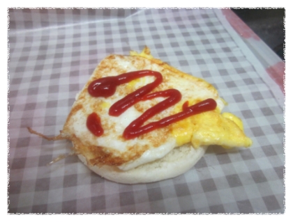 2.계란후라이 하나를 햄버거 패티 위에 올려주시고 토마토케찹을 뿌려주세요.