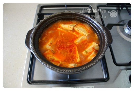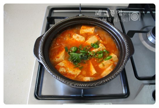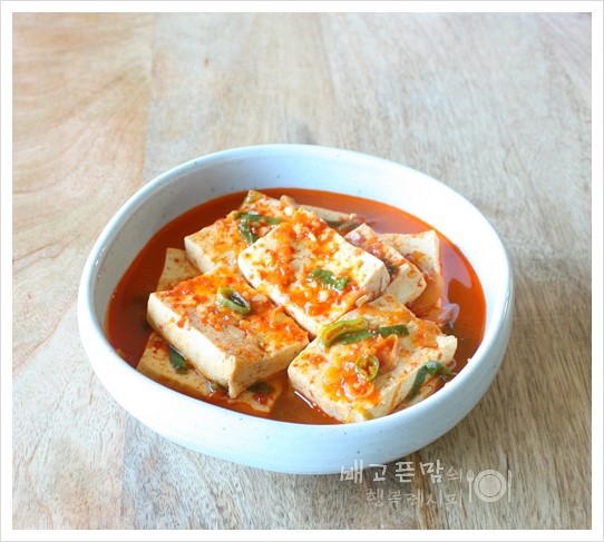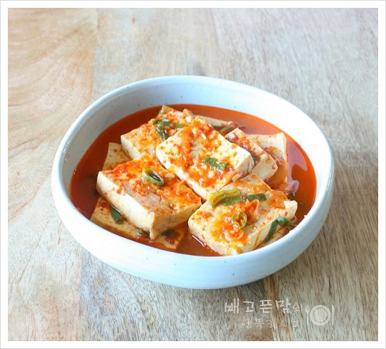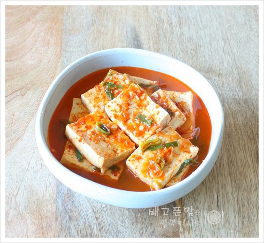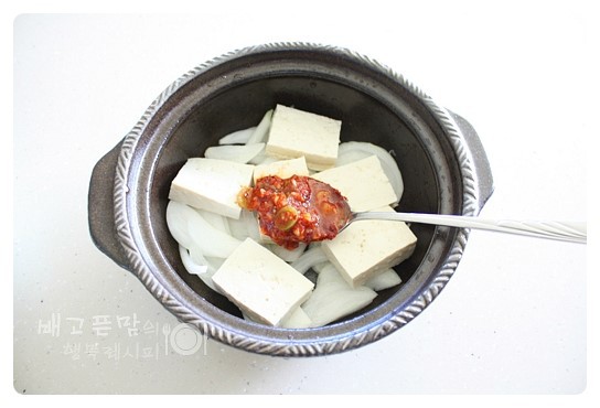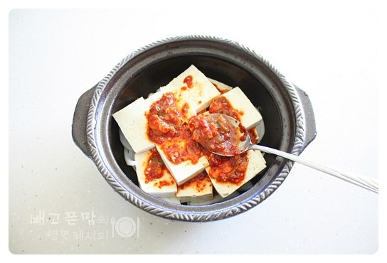 보들한 두부를 숟가락으로 함께 떠서 먹는