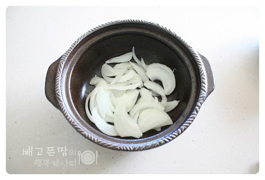 양파 1/2개를 채썰어 바닥에 깔아 줍니다.