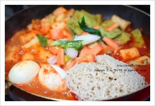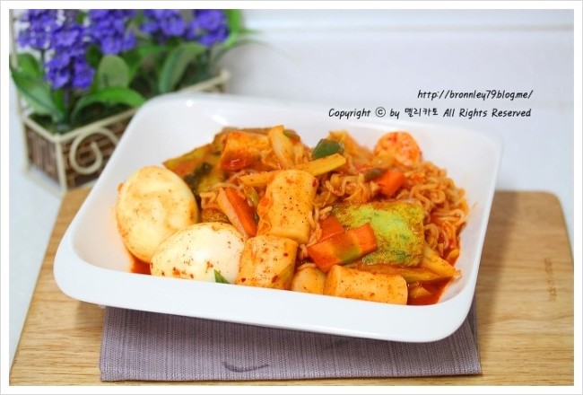 떡 3줌(260g), 어묵 240g, 계란 2개, 라면사리 1개, 파한줌, 양배추 한줌, 당근 한줌, 물 3컵, 다시멸치 10마리정도.. 라볶이양념: 고추장 2, 다진마늘 0.5, 고춧가루 1, 설탕 1, 맛술 1, 후추조금 (밥숟가락기준) |