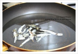 우선 물 3컵에 멸치 10마리 정도 넣어서 끓이다가 약불로 줄여서