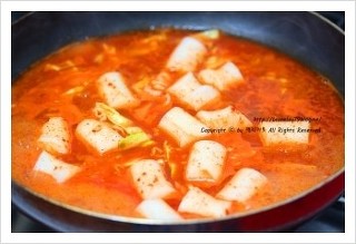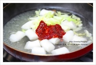 가래떡과 양배추, 라볶이 양념장을 넣고 끓여줍니다..!