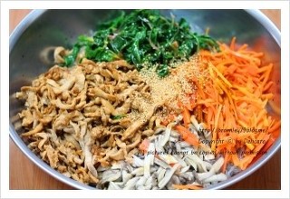 시금치는 끓는물에 소금을 넣어 데친후 소금과 참기름으로 무쳐주세요...^^