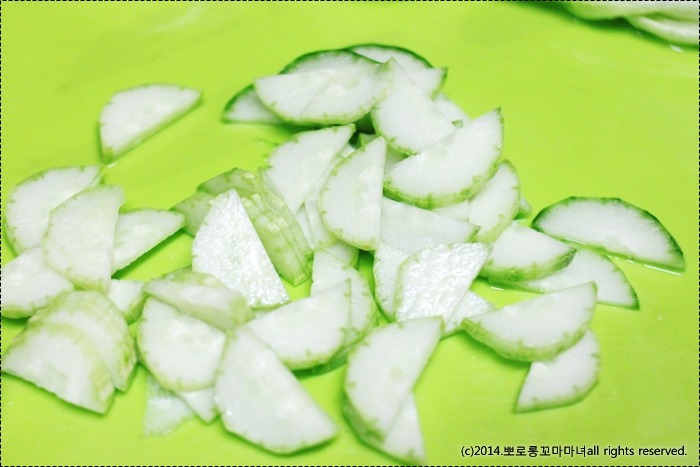 오이는 반으로 잘라서 얇게 슬라이스~(오이 안의 씨를 빼서 썰어도 좋아요)