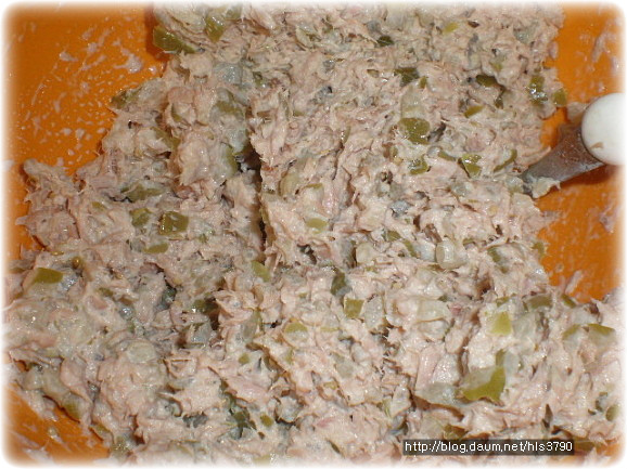 기름기 뺀 참치와 오이피클을 볼에 담고 마요네즈를 적당히 넣어주면 되요...