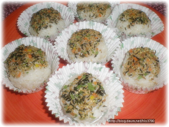 ***양념한 밥에 속재료 넣고 둥글게 둥글게 만든후 시중에 파는 "밥이랑"같은