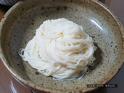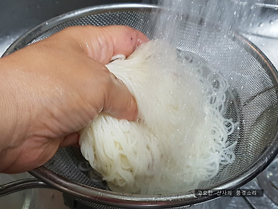 ㉡ 국수가 익으면 얼른 찬물에 담가 쓱쓱 비벼가며 씻어준다.