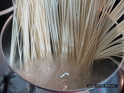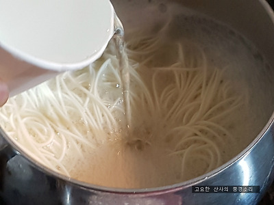 ㉠ 물이 끓으면 국수를 넣고 깜짝물을 부어가며 삶아준다.