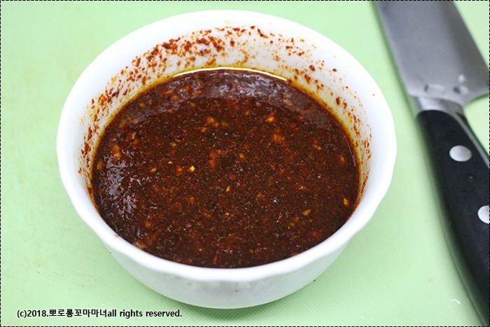 양념 : 간장 5큰술, 매실청 1큰술, 설탕 3큰술, 다진마늘 1큰술반, 고추가루 3큰술, 참기름 1큰술, 물 3큰술