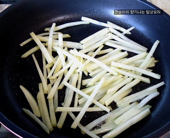 당근채보다 감자채가 약간더 굵게 썰어져서 포도씨유 두르고